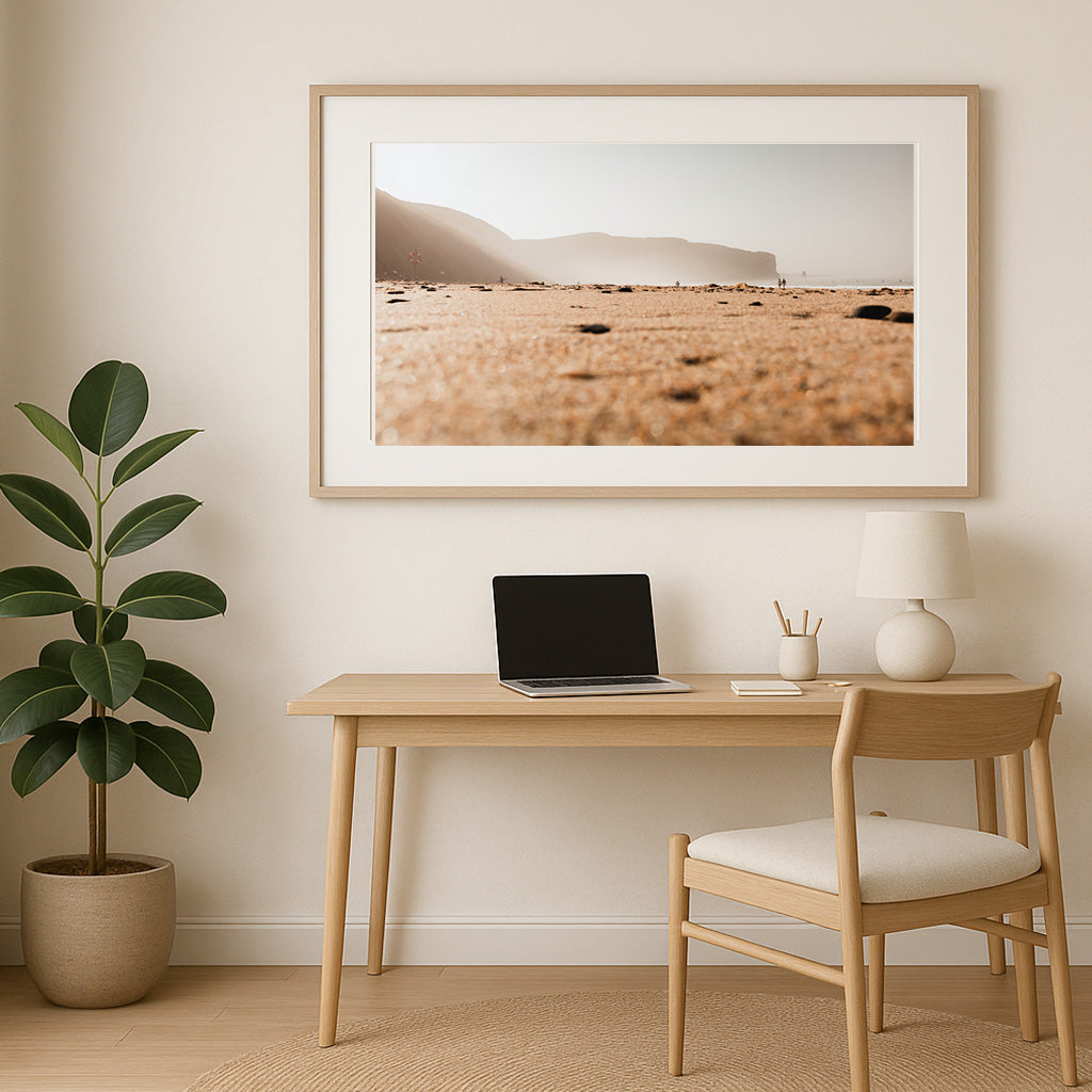 Direkt am Sand, mit dem Blick fast auf Augenhöhe, zeigt sich der Arrifana Beach in einem Moment reiner Magie: Die ersten Sonnenstrahlen spiegeln sich im Wasser, während sanfte Wellen den Strand küssen. Dieses Poster fängt die intime Perspektive eines Sonnenaufgangs ein – ruhig, kraftvoll und voller Naturpoesie.